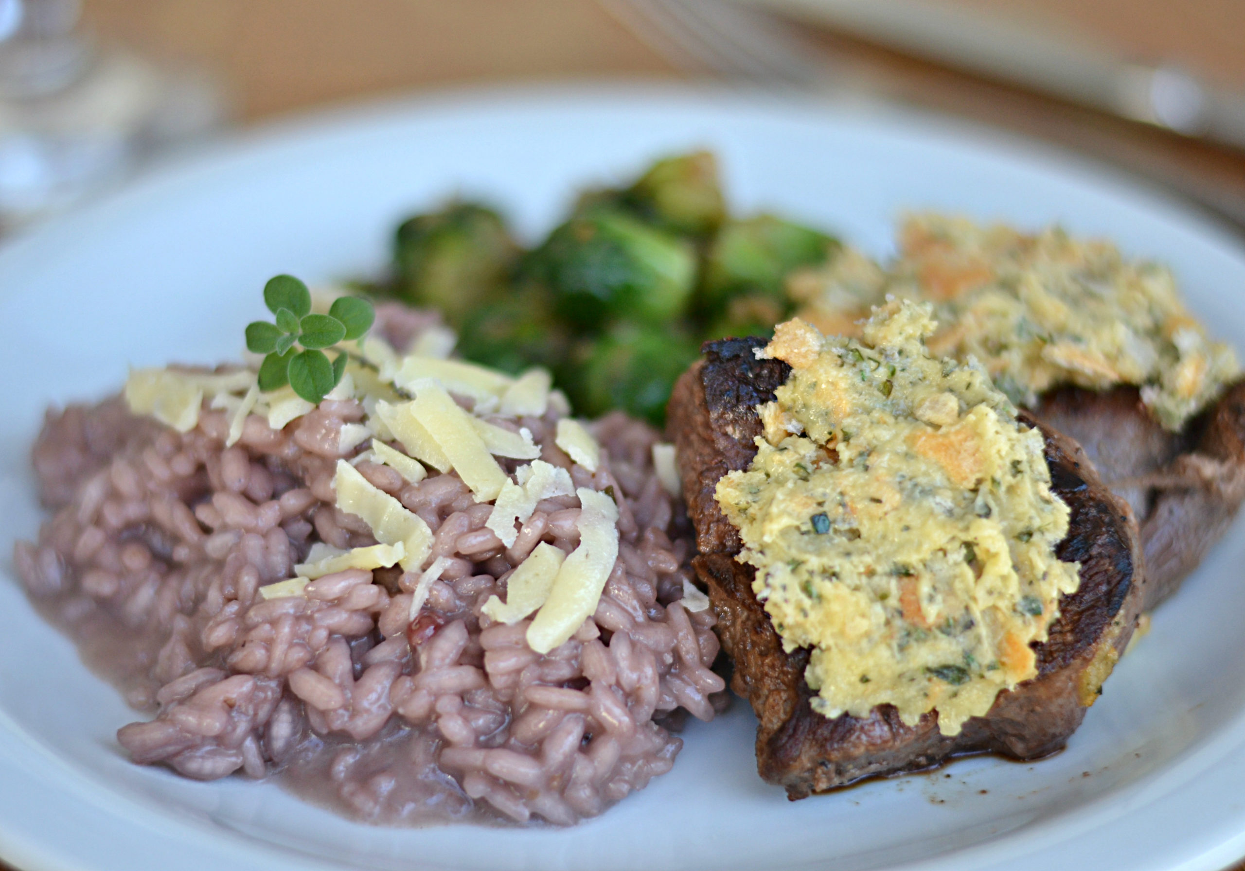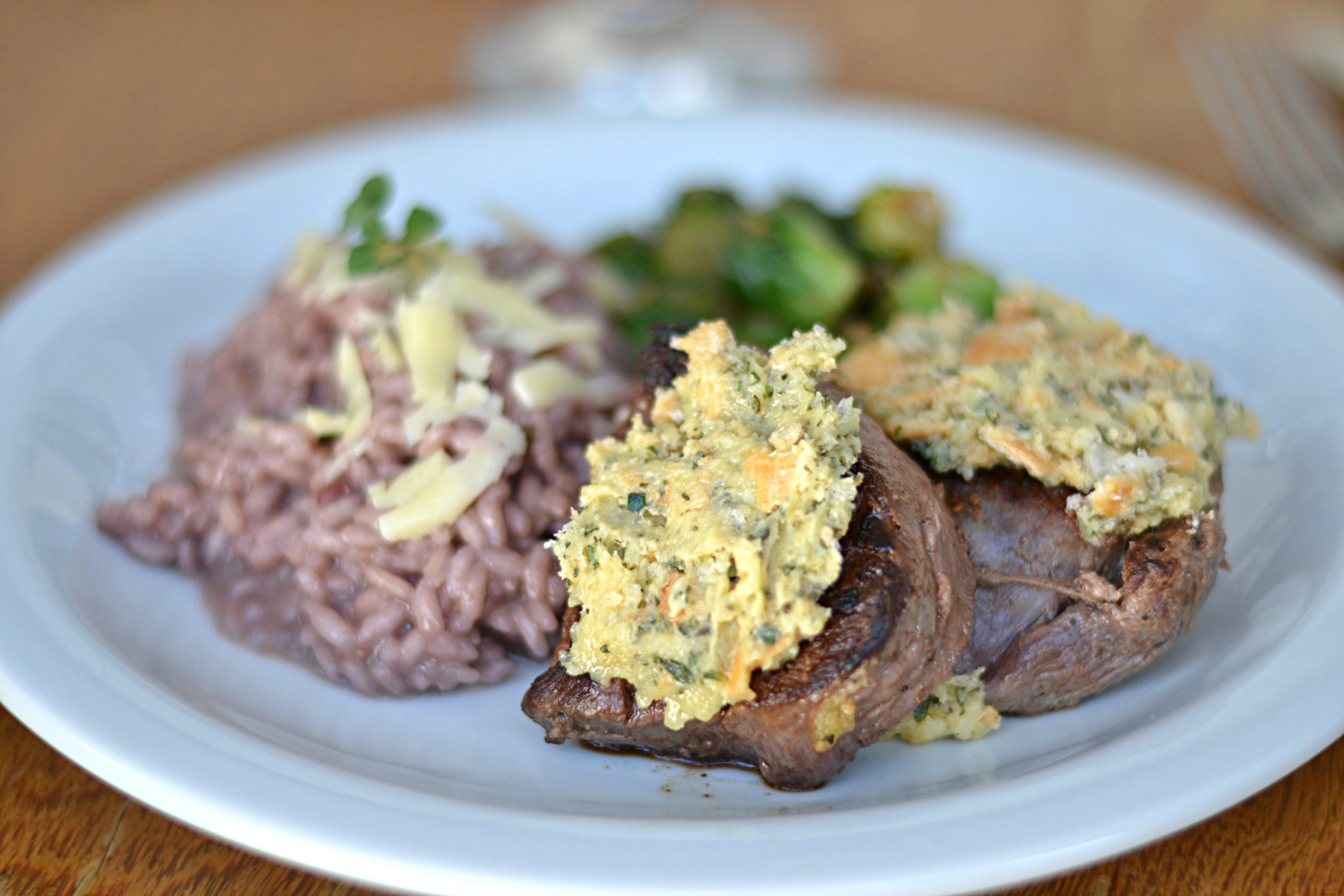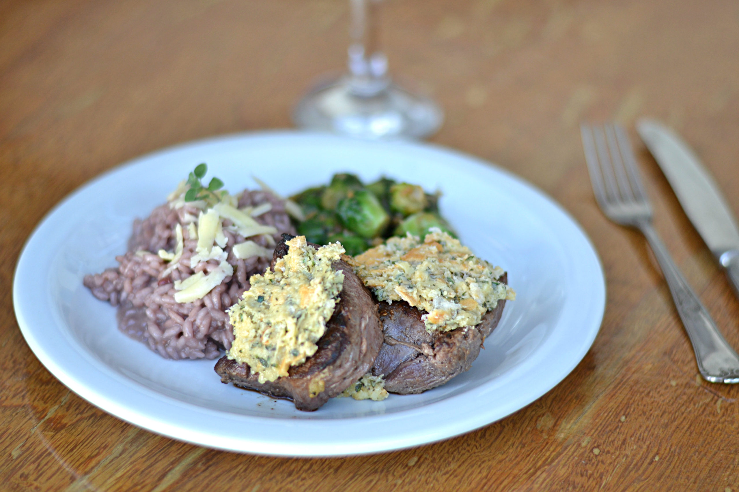 Suculenta carne selada e grelhada com uma deliciosa crosta de ervas frescas, a sálvia uma das ervas utilizadas tem como função combater o ácido úrico, cálculo renal e reumatismo. Ainda acompanha couve de bruxelas um rico alimento e conhecido por suas propriedades antioxidantes, que auxiliam no combate ao câncer de bexiga, pulmão, mama, são ricas em vitaminas A, C e E.