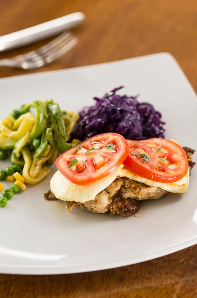 Filé de frango grelhado com uma generosa fatia de queijo branco e fatia de tomate, tornando o frango mais colorido e saboroso. Acompanha um delicioso carpaccio de berinjela que é um alimento rico em  fibras, vitaminas B, C, K e zinco, potássio, cálcio, ferro e magnésio.
