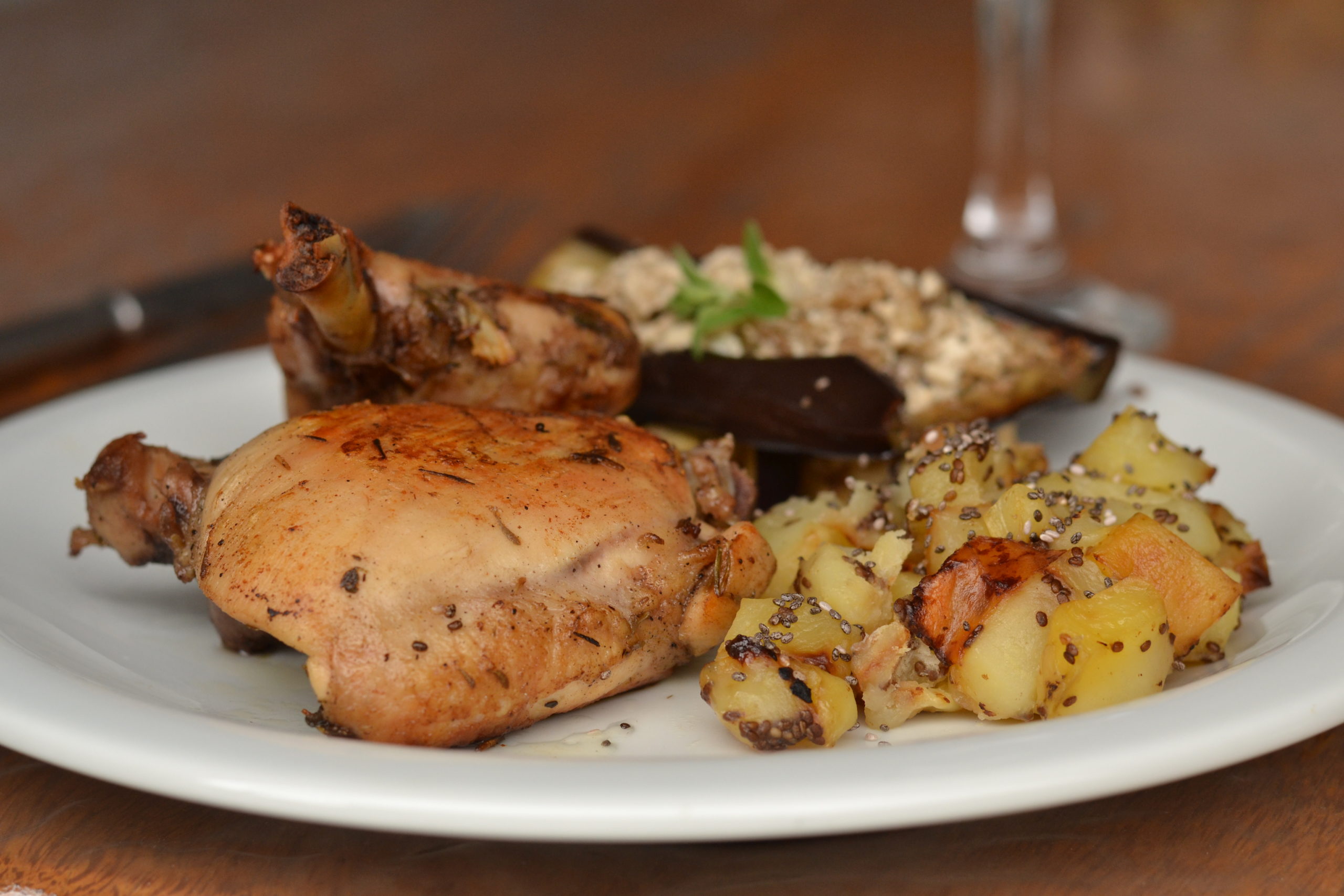 Um delicioso frango assado sem gorduras embebido em vinho branco e ervas frescas, tornou-se rico em fibras proveniente da batata com chia, um alimento nutritivo, que auxilia no funcionamento do intestino e no controle do diabetes, e ainda para tornar esse prato mais nutritivo, temos a berinjela que possui vitamina K, magnésio e potássio e um rico alimento que ajuda na inibição do crescimento de células cancerígenas.